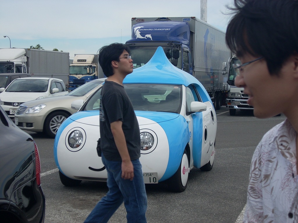 | 出発前に学科棟玄関で撮影!荷物はほとんどがお酒♪(爆) | 東名・海老名SAで一休み。大橋ジャンクションがナビに入っていなかった車は混乱したことでせぅ。 | エビつながりのご当地グルメがいろいろと。あと何故かメロンパンが売りだとか。 | SAの駐車場にて、某企業の営業車を撮影中にA陪氏が横切る構図(笑)。最新のEVとはいえ、営業マンの方・・・お気の毒というか何というか・・・(汗)。 |