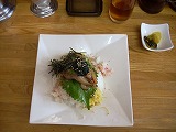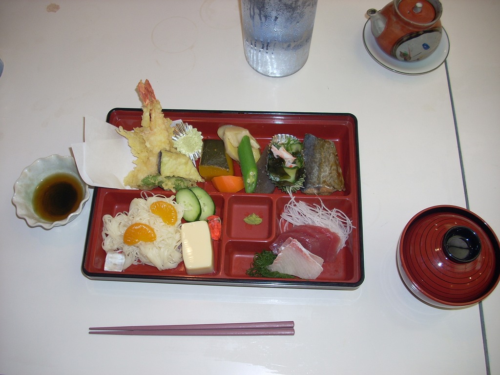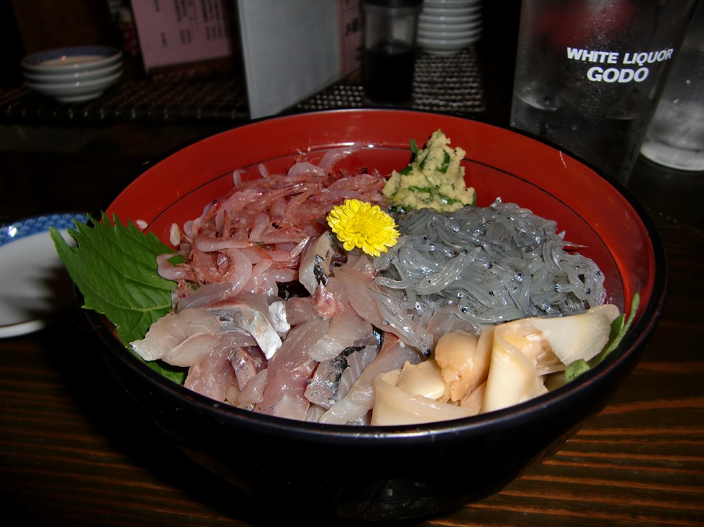 | 市場の中を歩いて食堂街へ。お昼なので階下でセリとかやってません。 | そのまま同じ通路を戻ってくる。「いい店がなくて・・・」 | それならば市場の外でお昼だ!豪華海鮮丼! | こちらはシンプルに地鯵丼です。 | 沼津港のメインストリートにはこんな「ご神体」があります。 |