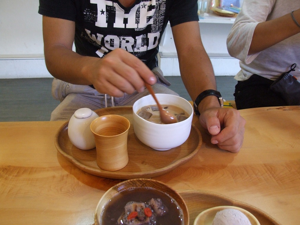 | お寺近くのカフェで。店外の連中は待たせましょ! | 手前はぜんざい、向こうはアイスコーヒーだす。 |